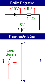 Yukarıdaki şekilde devreye bağlı bir zenerin ve direncin üzerine düşen gerilimler gösterilmiştir. Zener 10 Voltluktur. Bu yüzden zener diyot iletime geçene kadar tüm gerilim zener diyotun üzerindedir. Fakat zener diyot iletime geçtiğinde ise zener gerilimi zenerin üzerine geri kalanı ise direncin üzerine düşer.