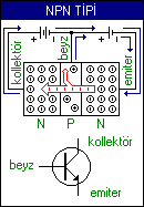 NPN tipi transistörler N, P ve N tipi yarı iletkenlerinin birleşmesinden meydana gelmiştir. Şekilde görüldüğü gibi 1 nolu kaynağın (-) kutbundaki elektronlar emiterdeki elektronları beyze doğru iter ve bu elektronların yakalaşık %1 'i beyz üzerinden 1 nolu kaynağın (+) kutbuna, geri kalanı ise kollektör üzerinden 2 nolu kaynağın (+) kutbuna doğru hareket ederler. Beyz ile emiter arasından dolaşan akım çok küçük, kollektör ile emiter arasından dolaşan akım ise büyüktür. Yan tarafta NPN tipi transistörün sembolü ve iç yapısı görülmektedir.