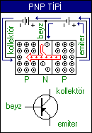 PNP tipi transistörler P, N ve P tipi yarı iletkenlerinin birleşmesinden meydana gelmiştir. Şekilde görüldüğü gibi 1 nolu kaynağın (+) kutbundaki oyuklar emiterdeki oyukları beyze doğru iter ve bu oyukların yakalaşık %1 'i beyz üzerinden 1 nolu kaynağın (-) kutbuna, geri kalanı ise kollektör üzerinden 2 nolu kaynağın (-) kutbuna doğru hareket ederler. Beyz ile emiter arasından dolaşan akım çok küçük, kollektör ile emiter arasından dolaşan akım ise büyüktür.Yan tarafta PNP tipi transistörün sembolü ve iç yapısı görülmektedir.