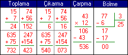 Binary sayı sisteminde iki adet sayı bulunur. Bunlar 0 ve 1 dir. Bu yüzden Binary sayı sisteminin tabanı 2'dir. (1011 2) şeklinde yazılır.Aşağıda Binary sayı sistemi ile toplama, çıkarma, çarpma ve bölme işlemleri görülmektedir.