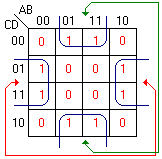 Yan tarafta karno haritası, tanımı ve lojik devresi görülmektedir. Lojik devre tasarlanırken ilk önce değişkenler ve değilleri hazırlanır. Daha sonra çarpımlar yani Ve kapıları yerlerine konur. En son olarakta toplamlar yani Veya kapıları yerlerine konur. Bu lojik devre en sade haldeki tanımdan oluşturulmuştur. Eğer tam sadeleştirilmemiş bir tanımdan lojik devre tasarlanırsa gereksiz fazlalıkta lojik kapı kullanılmış olur. Bu da gereksiz yere masraftır.