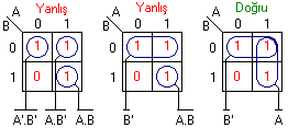 Değişiklik gösteren değişkenler etkisiz sayılır. Alınan değişken 0 ise tanıma değişkenin değili, 1 ise de değişkenin kendisi yazılır. Örneğin yan tarafta doğru olan karnoda üstteki yatay grubu ele alalım. Grup iki kutu kapsıyor. Bu kutular A 'nın ve B 'nin 0 olduğu (A'.B') kutudur. Diğer kapsadığı kutu ise A 'nın 1, B 'nin ise 0 olduğu (A.B') kutudur. İki tanımı ele aldığımızda (A'.B') - (A.B') A değişkeninin değiştiğini B değişkeninin ise sabit kaldığını görüyoruz. Bu durumda A değişkeni etkisizdir. Yani A, 0 'da 1 'de olsa çıkışı erkilemez. Tanım olarak B' 'li alıyoruz.