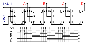 Yukarıda da görüldüğü gibi asenkron sayıcılarda flip flop'lar ard arda yani seri bağlanmıştır. Flip flop 'ların Q çıkışları kendinden sonra gelen flip flop'un clock ucuna bağlanmıştır. Bu durum sayıcıda yavaşlamaya sebep olur. Devrenin altında görülen grafik ise flip flop'ların çıkış grafiğidir. Grafikteki yükselmeler çıkışın 1 olduğunu düşmeler ise çıkışın 0 olduğunu temsil eder. Grafikten de anlaşılacağı gibi A çıkışı clock palsinin, B çıkışı A çıkışının, C çıkışı B çıkışının ve C çıkışı da D çıkışının yarı frekansı kadardır. Aşağı sayıcı yapılmak istenirse devre çizimindeki flip flop'ların Q çıkışından clock uclarına yapılan bağlantılar Q' 'den alınmalıdır. Çıkış tablosuda yandaki tablonun aşağıdan yukarı doğru okunan halidir.