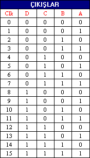 Şimdi 4 bit (4 çıkışlı) asenkron sayıcıyı ele alalım. 4 bit sayıcı için dört adet flip flop kullanacağız. Aşağıda 4 bit asenkron sayıcının çizimi ve çıkış tablosu görülmektedir.