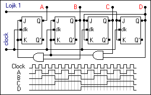 Yukarıdaki devre çizimine bakıldığında senkron sayıcının asenkron sayıcıya göre biraz daha karışık olduğu anlaşılabilir. Yine yukarıda görüldüğü gibi tüm flip flop'ların clock ucları bir birlerine bağlıdır. Yani hepsi aynı anda clock palsi alırlar .Bu da devrenin çalışmasına hız kazandırır. Devrenin altında görülen grafik ise flip flop'ların çıkış grafiğidir. Grafikteki yükselmeler çıkışın 1 olduğunu düşmeler ise çıkışın 0 olduğunu temsil eder. Grafikten de anlaşılacağı gibi A çıkışı clock palsinin, B çıkışı A çıkışının, C çıkışı B çıkışının ve C çıkışı da D çıkışının yarı frekansı kadardır. Eğer aşağı sayıcı yapılmak istenirse devredeki Ve kapısının giriş ucları flip flop'ların Q uclarından değilde Q' uclarından alınmalıdır. Tablosu ise yukarıdaki tablonun aşağıdan yukarı doğru okunuşudur.
