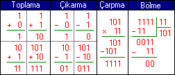 Binary sayı sisteminde iki adet sayı bulunur. Bunlar 0 ve 1 dir. Bu yüzden Binary sayı sisteminin tabanı 2'dir. (1011 2) şeklinde yazılır.Aşağıda Binary sayı sistemi ile toplama, çıkarma, çarpma ve bölme işlemleri görülmektedir.