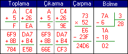 Hexadesimal sayı sisteminde 16 adet rakam bulunur.Bunlar 0 1 2 3 4 5 6 7 8 9 A B C D E F'dir. Tabanı ise 16'dır ve (1D2A 16) şeklinde yazılır. Aşağıda Hexadesimal sayılarlar toplama, çıkarma, çarpma ve bölme işlemleri görülmektedir.