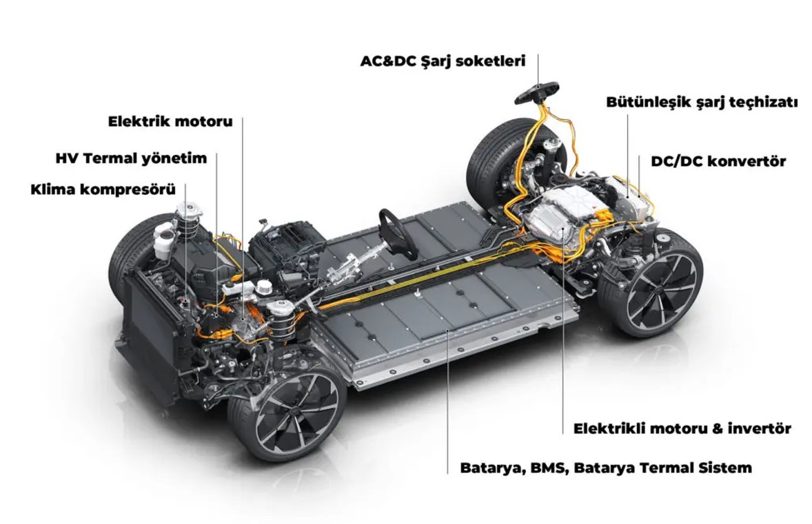 - Bataryadaki doğru akım motora verilmeden önce kontrol ünitesine gönderilerek alternatif akıma dönüştürülüyor.
