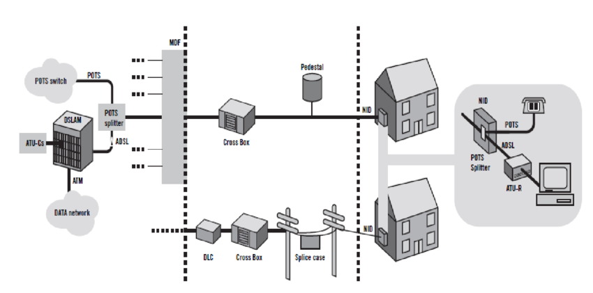 Modülasyon teknikleri geçmeden önce DSLAM (Digital Subcriber Line Acces Multiplexer) den bahsetmek istiyorum. ADSL servisini sağlayan firmalar, kullanıcıların hatlarından gelen bağlantılarını bir araya getirip internete çıkartmak için DSLAM kullanırlar.Bir çeşit ağ cihazıdır ve bir tarafı güçlü bir internet omurgasına bağlıdır. Statik yada dinamik IP adreslemesi ve gereken yönlendirme işlemlerini yapan hep DSLAM 'dır. Ayrıca çoğu birden fazla farklı modülasyon tekniğini destekleyebilir. Aşağıda komplike ve basit bir DSLAM görebilirsiniz.