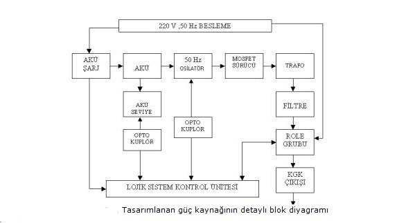 Bu devrede, çıkış gücü 200VA olan bir kesintisiz güç kaynağı geliştirilmiştir. Kesintisiz güç kaynağının giriş ve çıkış gerilimleri 220V AC dir. Batarya gerilimi 12V 'tur. Tasarlanan sistem lojik kontrol birimi tarafından kontrol edilmektedir. Lojik kontrol birimi akü seviyesine göre aküyü şarj etmekte ve şebeke de elektrik kesilmesi meydana geldiğinde röle ile anahtarlama yaparak yükün elektriksiz kalmamasını sağlamaktadır.