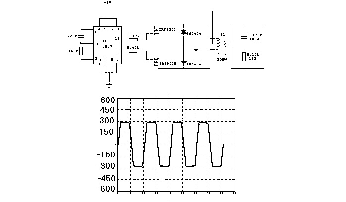 Tetikleme elemanı olarak kullandığımız IRFP250 güç MOSFET' inin gate ucuna Q ve O uçları bağlanmaktadır. Böylece N tipi Mosfet çıkışların + alternasında iletime geçmektedir. MOSFET'in biri iletimde iken,diğeri kesimde olacaktır. Her MOSFET saniyede 50 kez anahtarlama yaptığı için yükselten transformatörün tetiklenmesi için gerekli olan 50 Hz frekansı elde edilmiş olur.