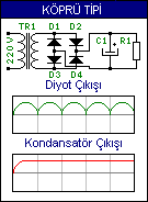 Bu doğrultmaç tipinde AC güç kaynağının her iki kutbuda filtre edilir. Bunun için hazır Köprü Tipi Diyotlar mevcuttur. D1 ve D2 diyotları AC güç kaynağının bir kutbunu D3 ve D4 diyotlarıda AC güç kaynağının diğer kutbunu filtre eder. Bu sayede her iki kutupta filtre edilmiş olur. Bu da daha iyi bir filtre sağlar. En son olarakta C1 kondansatörü ile yarım sinüs dalganın aralarındaki boşluklar doldurulur. R1 direnci ise yük direncidir. Sağ tarafta köprü diyodun ve kondansatörün çıkış frekanslarını görebilirsiniz.