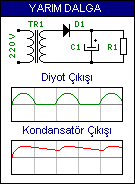 Sol tarafta görülen yarım dalga doğrultmaçtaki D1 Diyotu AC Güç Kaynağının bir ucunu tek yönde filtre eder. Yani belli bir düzende artı ve eksi arasında geçiş yapan kutbun sadece artı yönündeki akımın geçmesine izin verir. Bu sayede AC güç kaynağının iki kutbu arasında sadece tek yönde akım geçişi sağlanmış olur. Diyottan sonraki çıkış grafiği soldaki gibidir. Daha sonraki C1 Kondansatörü gerilimin yükseliş anında sarj olur, düşüş anında ise deboladığı gerilim sayesinde düşmeyi geciktirir. Kondansatörden sonraki çıkış grafiği solda görülmektedir. En sonda yer alan R1 direnci ise yük direncidir. Buraya istenilen yükü bağlayabilirsiniz. Ama kaldırabileceği kadar yük bağlamanızı tavsiye ederim.